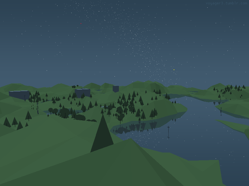 Seeing as how my previous post on low-poly masters Geo A Day seemed to go great guns in propelling their art into the wider sphere, let’s see if we can’t do the same with this gorgeous nightscape from Voyager3, a work-in-progress by Australia’s Brendan ‘bjzaba_‘ Zabarauskas, that’s eschewing G-A-D’s filtered luminosity for razor-sharp vectors, to just as beautiful results (zoom in here for full-crispness).