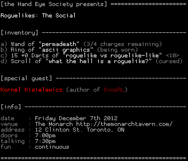 A reminder for all our Toronto indie friends and an update for those that might not have yet seen: this Friday, December 7th will see the latest meetup of the city’s Hand Eye Society — the progenitors of hyper-local indie game meetups — with a series of talks on the subject of roguelikes.