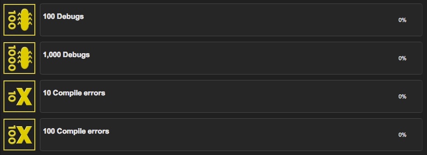 Interestingly, the Steam release of GameMaker also comes with its own list of achievements earned by creating games with the package, including the compiler error medals pictured above, which seems to be a dubious honor indeed.