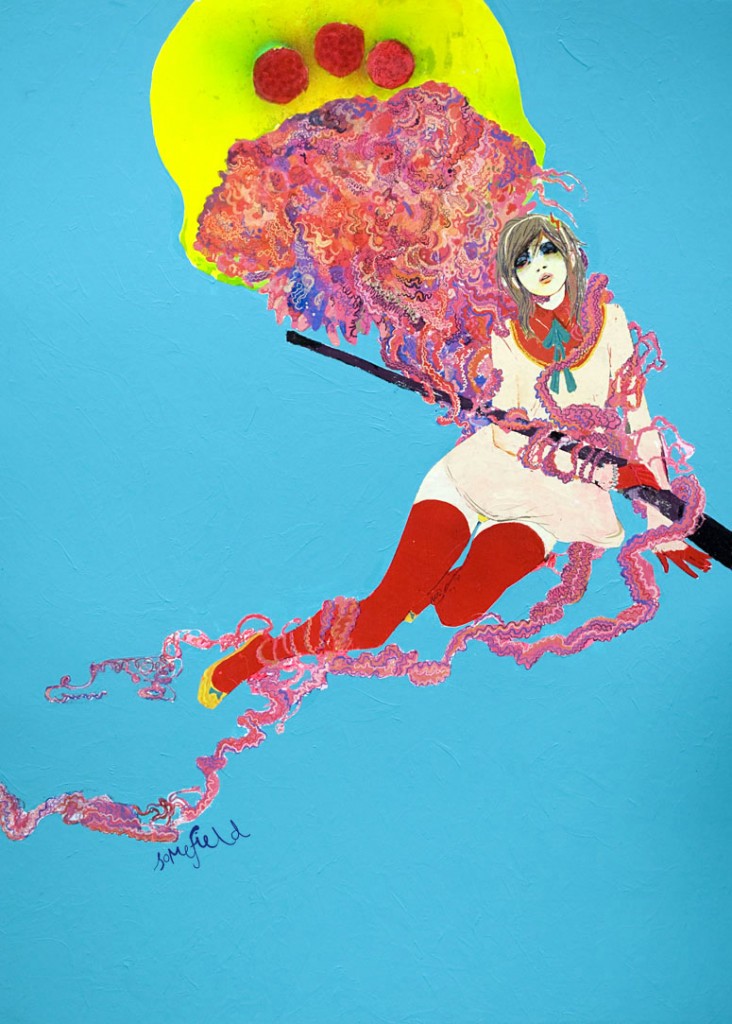 Another piece for the Fangamer VERSUS Attract Mode art show, Mare Odomo‘s more autobiographical ‘DS Club‘ piece illustrates a time where “we spent our lunches playing Mario Kart, having math battles in Brain Age, and pictochatting the things that teenagers pictochat. It was the best.”